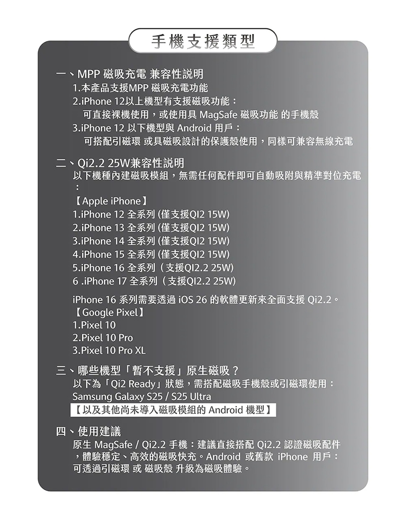 - 適用機型:iPhone 12 以上、Qi 認證手機(需搭配磁吸手機殼)